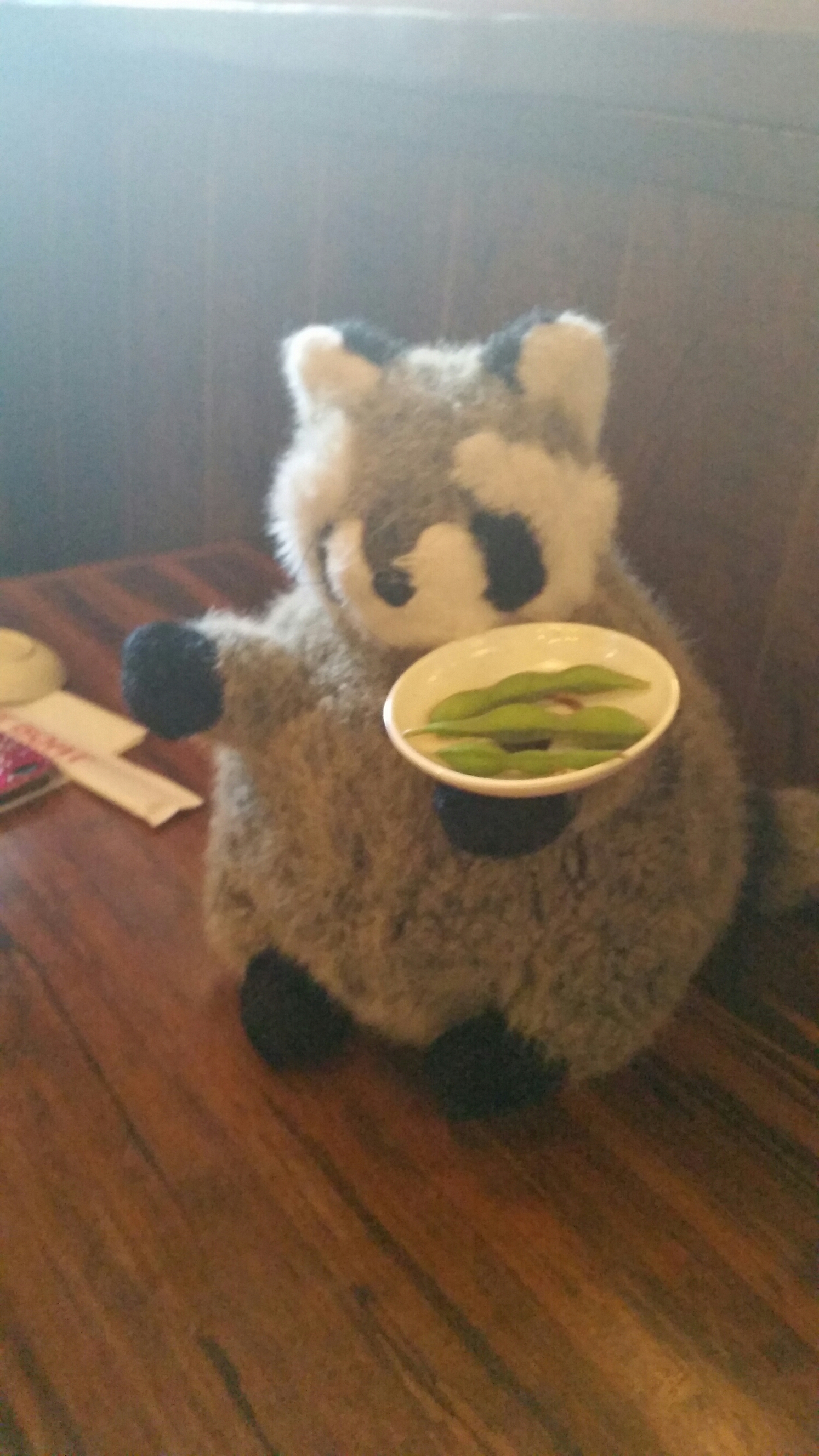 Then suddenly, it seemed to KoonKoon, they were done and Ariel got the food she needed for her smaller humans at home.  They girls had changed their minds and decided to have sushi instead.  KoonKoon was so thrilled, he loved sushi, it was one of his favorite food types ever.  The sushi was delicious, especially the eel and the House Special Roll, which was smothered with Sriacha Mayo.  He had never tried it before but it was so delicious!  He pretended he was a waiter because his little plate was the perfect size.  “Edamame anyone, on the house”? “My top secret mouth watering recipe”.
