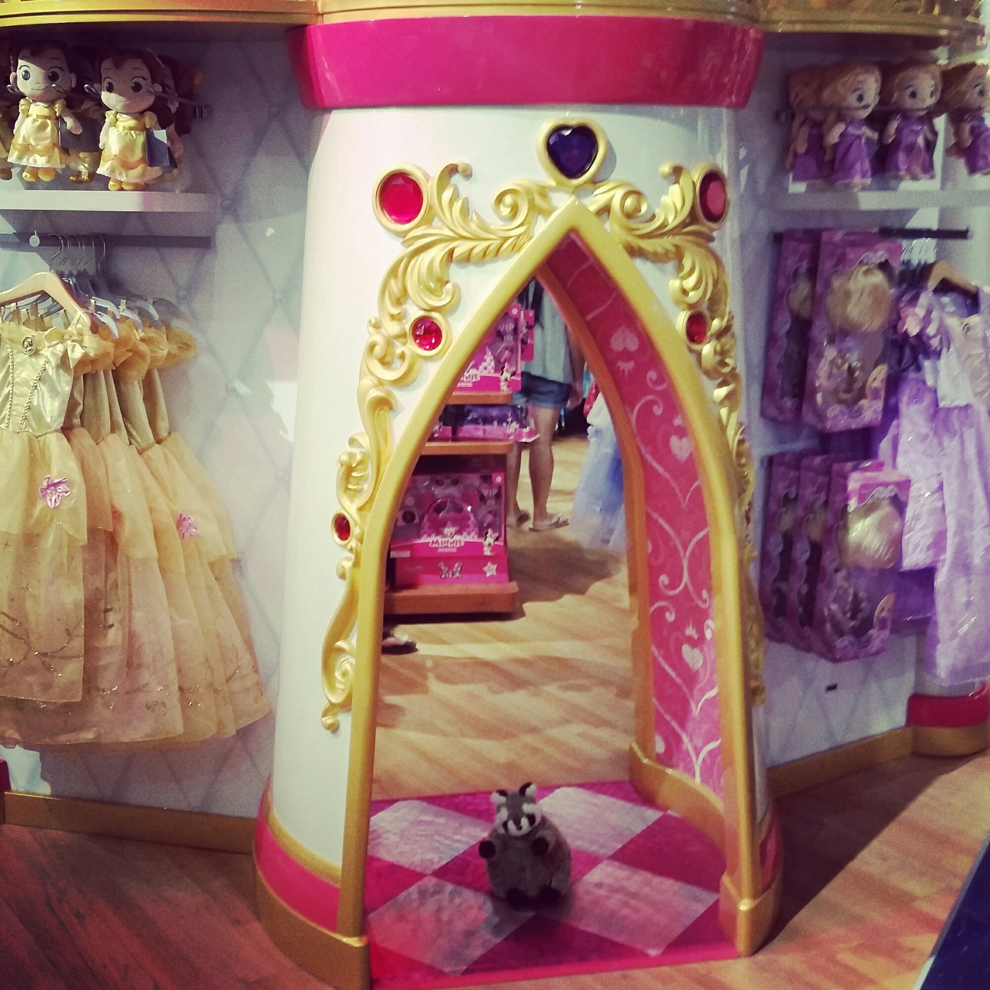 The group hit the Disney Store next.  “Oh my … goodness …”, KoonKoon was so speechless.  He jumped up and down and ran to the castle.  He knew he had to send a picture to his friend Kiki Bear.  So he did his best princely pose and his mom took the picture.