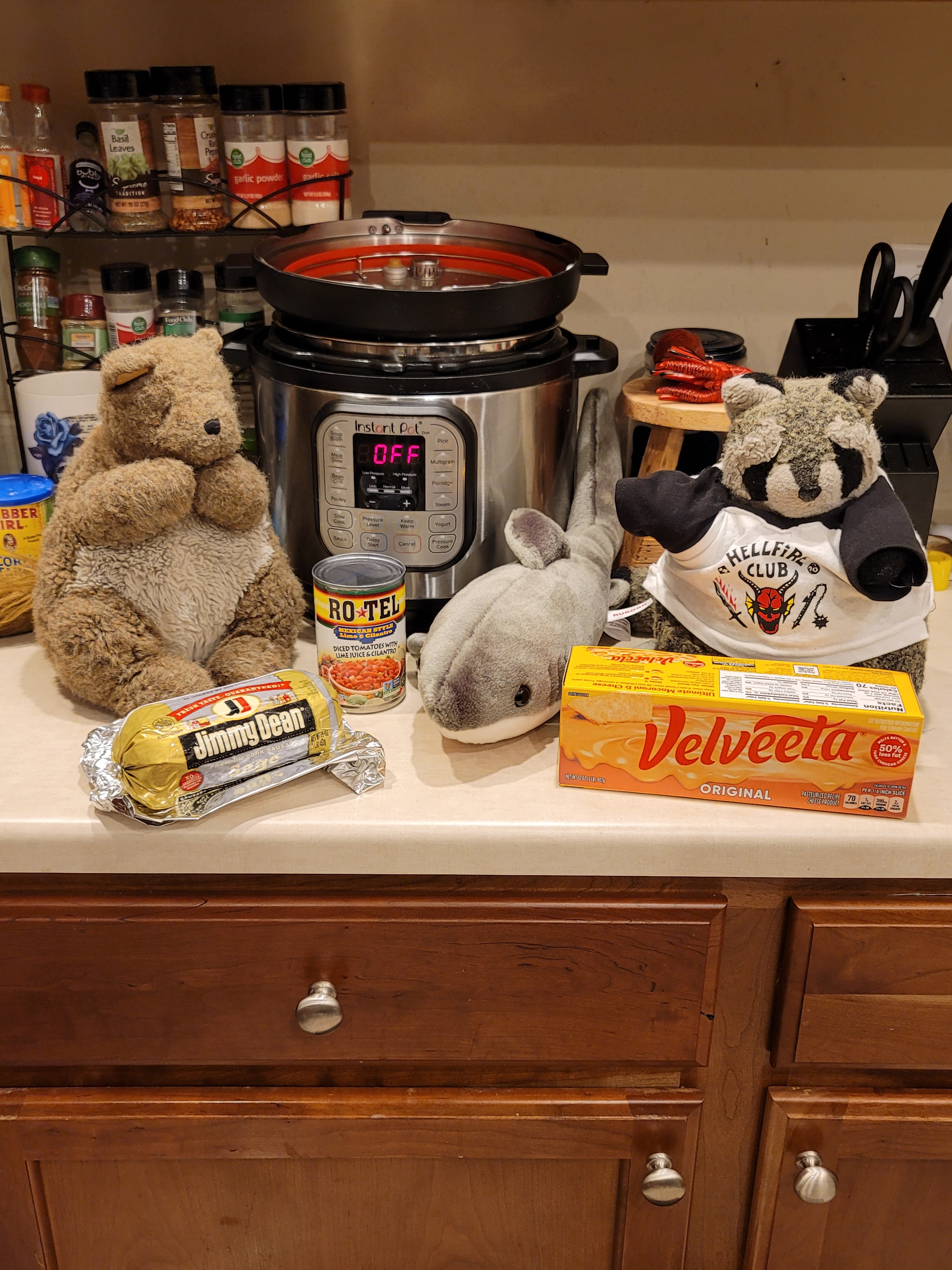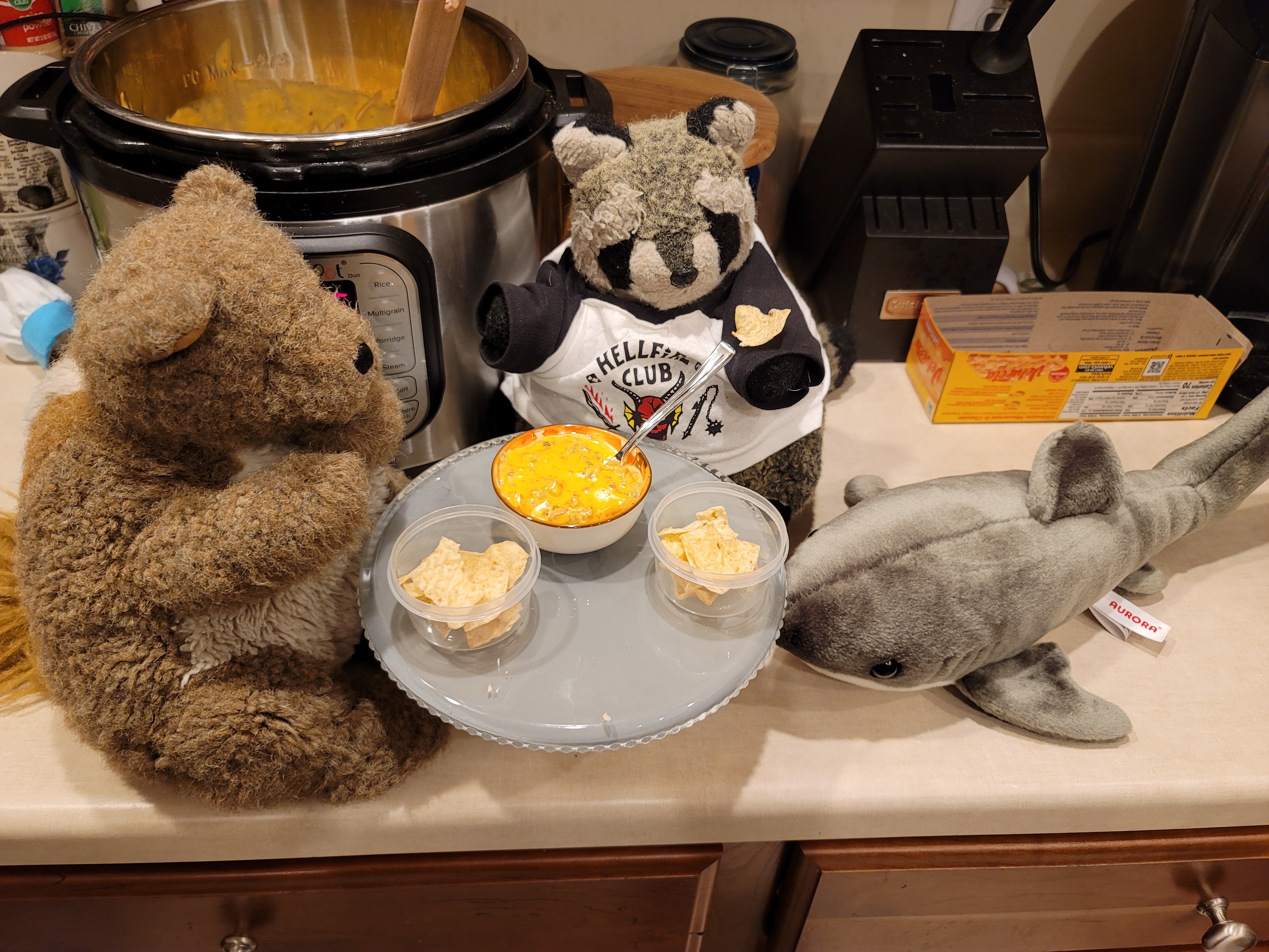 Hello friends! Welcome back to Cooking with Plushies! We are your chefs, KoonKoon, ChipChip, and Sharky McSharkerson. Today we are making a delicious cheese dip that is soooo easy and quick to make. You only need four ingredients.